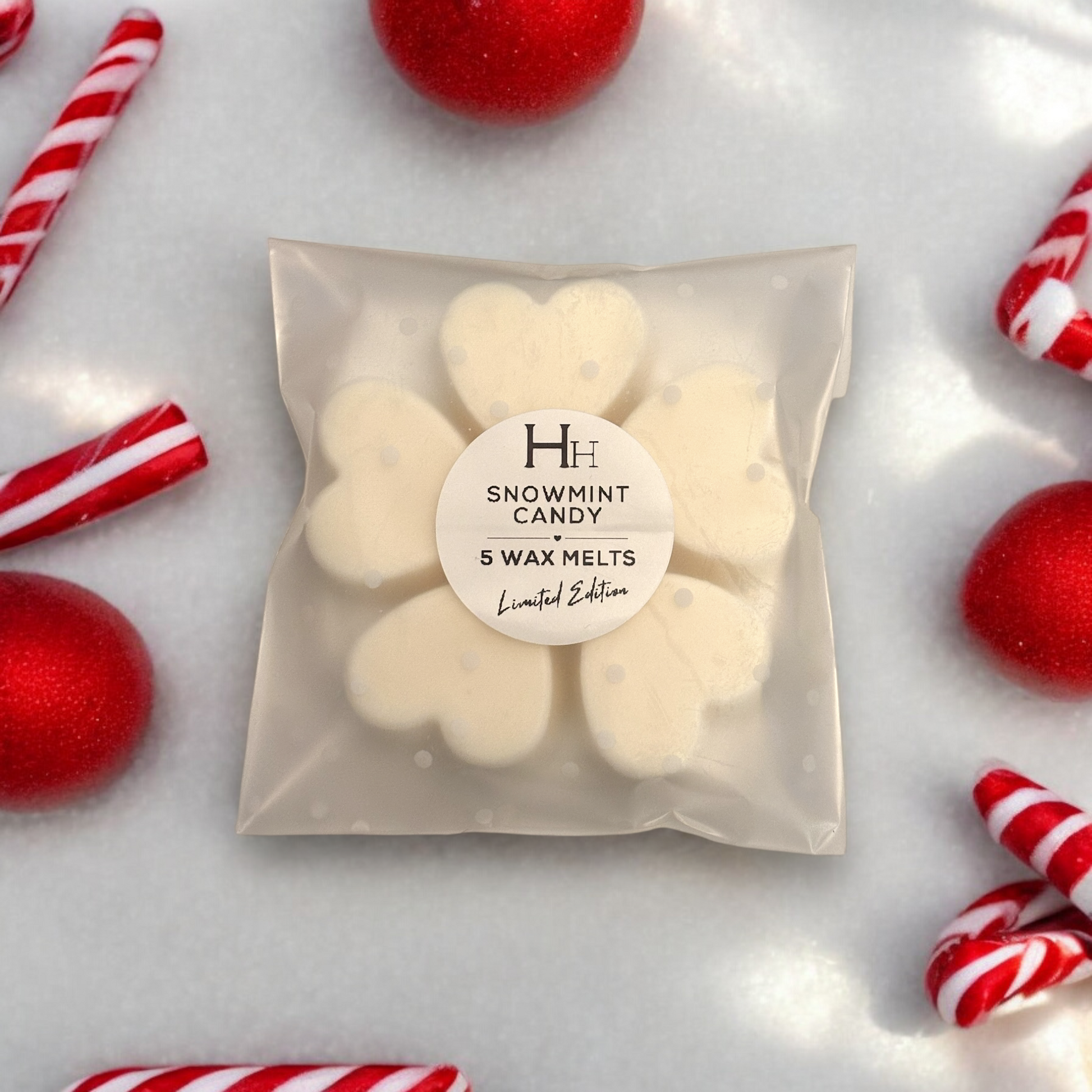 Introducing our Snowmint Candy Heart Wax Melts, the perfect way to bring the sweet, minty magic of candy canes into your home this holiday season! These heart-shaped melts capture the crisp, refreshing scent of peppermint, evoking the nostalgic charm of festive candy canes.